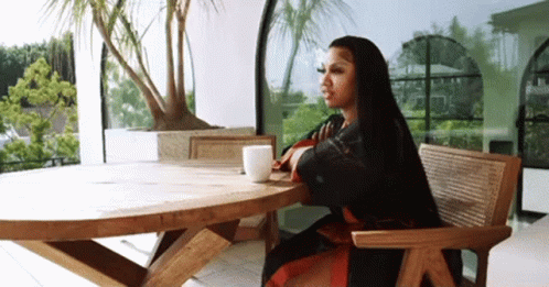 Ariana Therealkylesister sitting at a wooden table, drinking from a white cup.