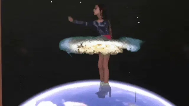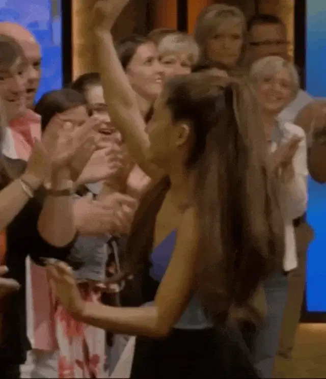 Ariana Grande, wearing red headphones, talks into a microphone at Power 106 FM, with Knotanthony.