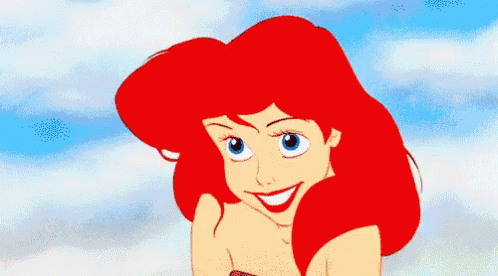 Ariel from The Little Mermaid smiles brightly with her blue eyes and red hair against a cloudy sky.
