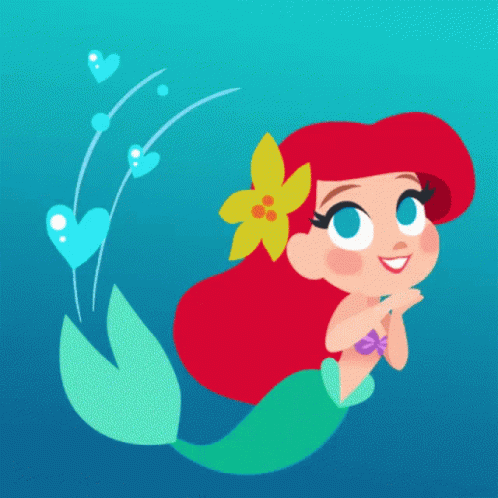 Ariel the Mermaid floats gracefully in the water, surrounded by hearts and a golden flower.