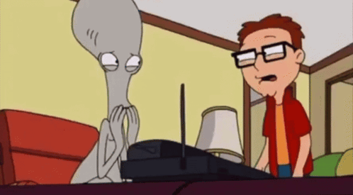 Steve and Roger from American Dad look scared while reacting to something on a phone or device.