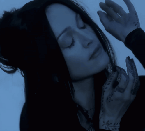 Madonna, as Ariescarey, with closed eyes and intricate hand tattoos in the 'Frozen' music video.