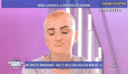Italian singer Arisa appears on the TV show 'Domenica Live', looking pensive with a shaved head.