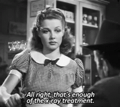 Ann Sheridan delivers the line 'All right, that's enough of the x-ray treatment' in a classic film scene.