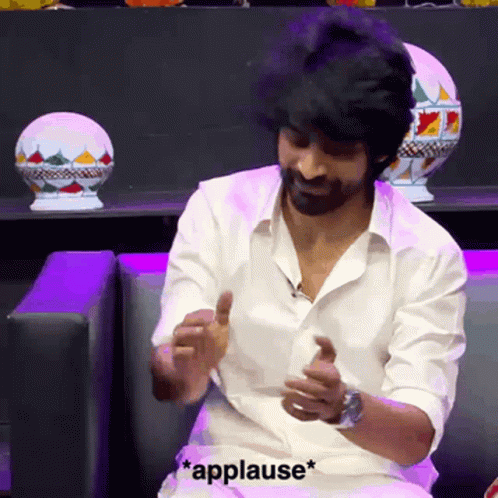 Indian actor Arjun Das applauds while sitting in a chair, showing appreciation.