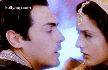 Arjun Rampal and Ameesha Patel share an intense, close-up gaze in a romantic Bollywood scene.