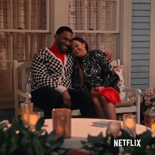 Moz Mckellan (Anthony Alabi) and Cocoa Mckellan (Tia Mowry) share a tender arm wrap moment on the porch.