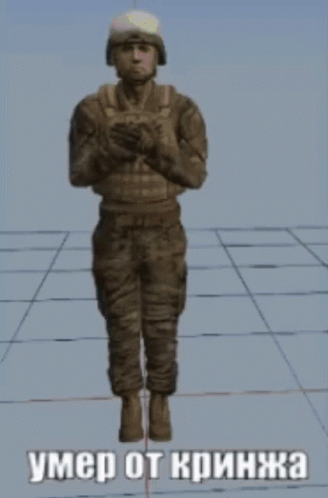 A 3D soldier model from Arma 3 is shown with Russian text "умер от кринжа" (died from cringe).