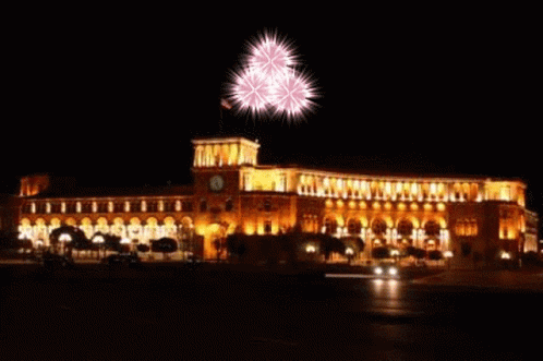Spectacular fireworks light up the night sky over a grand building, celebrating Armenia and Artsakh.