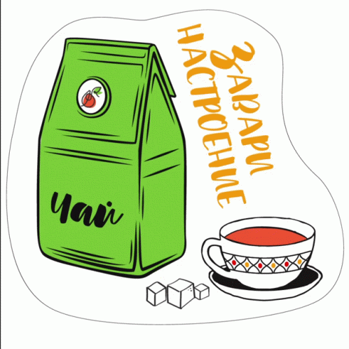 Illustration of a green tea bag and a cup of tea, with the Russian phrase 'Brew the mood'.