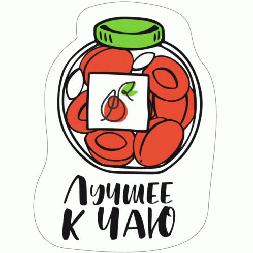 A vibrant sticker featuring a jar of apricots with a label, and Russian text 'Лучшее к чаю' (Best for Tea).