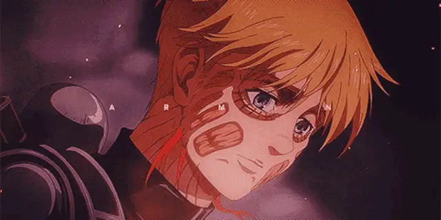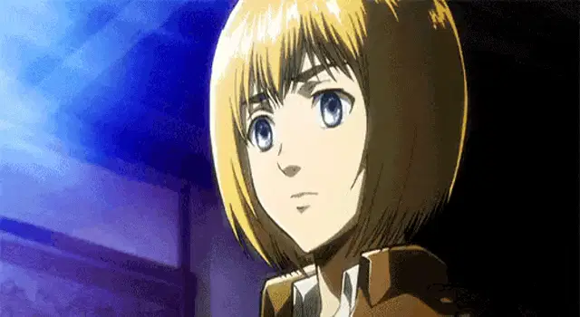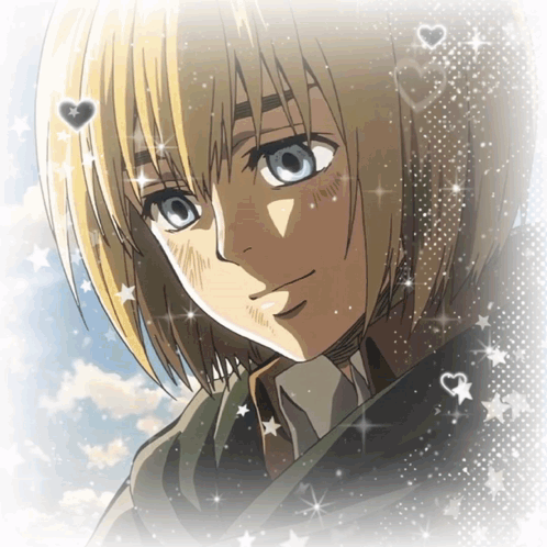Close-up of Armin Arlert, the blonde anime character, surrounded by sparkling hearts and stars.