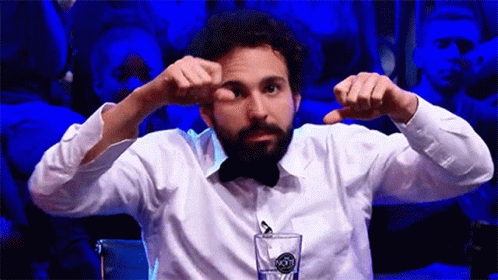 Murilo Couto, wearing a bow tie, makes a finger gun gesture while on the set of The Noite with Danilo Gentili.