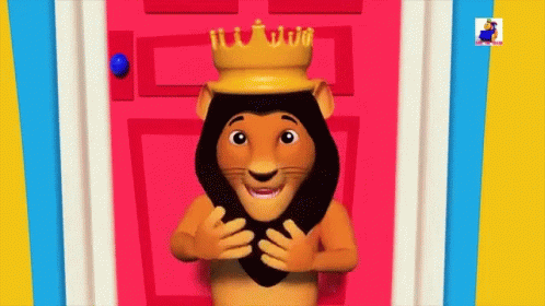 A cartoon lion from Bob The Train, wearing a crown, stands with arms wide open in front of a red door.