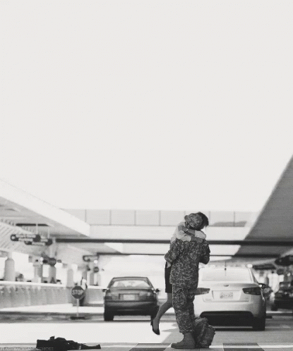 A soldier in uniform shares an emotional jumping hug with a loved one at an airport, a heartwarming reunion.