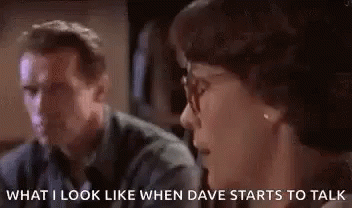 Arnold Schwarzenegger gives an intense, serious glare as someone named Dave begins to speak, showing a strong reaction.