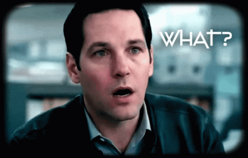 A man reacts with a surprised and confused expression, with the word 'WHAT?' overlaid on the screen.