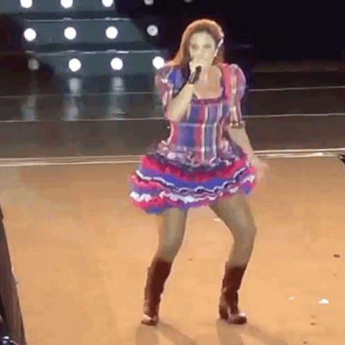 Ivete Sangalo performs at Arraiá da Veveta, dancing on stage in a vibrant plaid dress and cowboy boots.