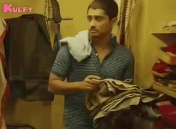 Siddarth tidies up his cupboard, organizing a pile of clothes with a towel draped over his shoulder.
