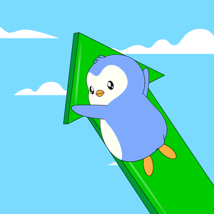 a blue and white penguin is holding a green arrow pointing up