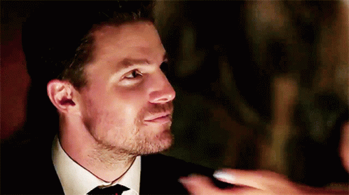Felicity Smoak (Emily Bett Rickards) shares a tender kiss with Oliver Queen (Stephen Amell) in a romantic moment from Arrow.