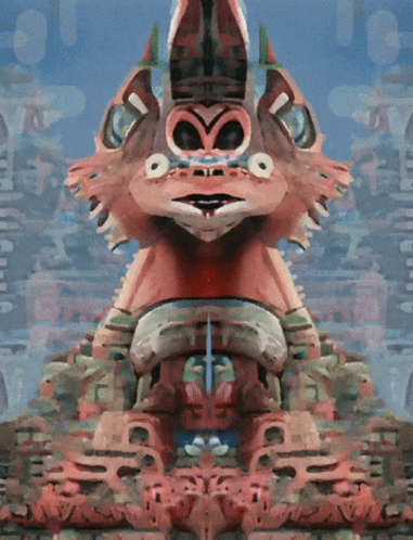 Stylized Mexican Aztec art featuring an axolotl-like deity figure with intricate patterns and bold colors.