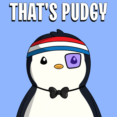 Animated Pudgy Penguin NFT character wearing a headband, with 'THAT'S PUDGY' caption.