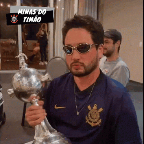 Arthur Elias, wearing sunglasses and a Corinthians shirt, proudly holds the Copa Libertadores trophy.
