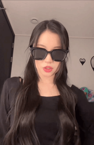Asa Enami Asa from BABYMONSTER, wearing sunglasses and a black top, looks directly at the camera.