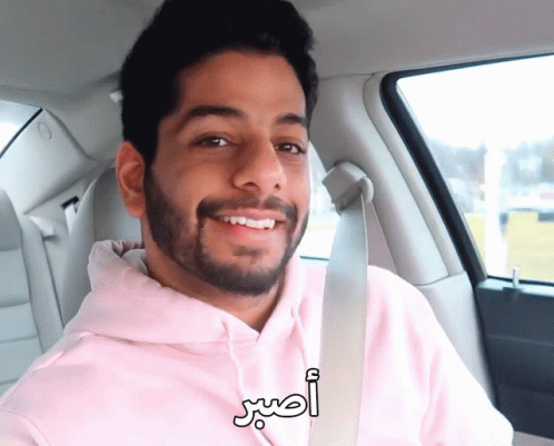 Man in pink hoodie with 'Wait' text, gesturing patiently in a car.