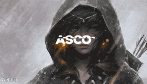 Digital art featuring a mysterious hooded woman with a bow, with the words "ASCO" and "Aeldra" overlaid.