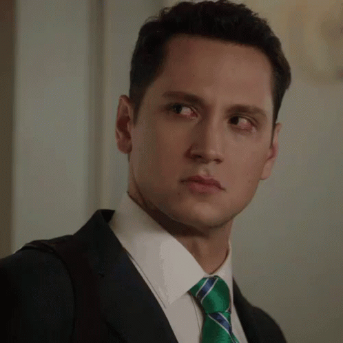 Asher (Matt Mc Gorry) makes a disgusted or crying face while wearing a suit and tie.