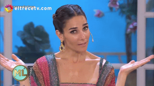Juana Viale in a vibrant, multicolored dress, gesturing on set.
