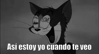 Tom from Tom and Jerry, love-struck with 'LOVE' written on his eyes, accompanied by the Spanish text 'Así estoy yo cuando te veo'.