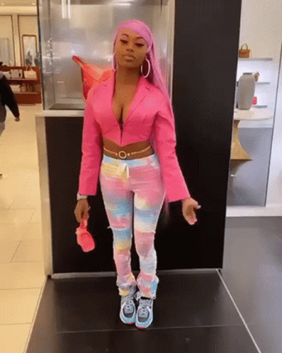 Asian Doll, also known as Asiandabrat, showcases her vibrant pink outfit and long pink hair.