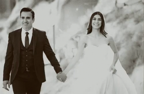 Emrah and Burcu from Aşk Ve Mavi holding hands and smiling on their wedding day in a beautiful black and white moment.