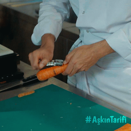 Chef Kadir Doğulu from Aşkın Tarifi peels a carrot, showcasing culinary skills for the Ntc Medya series.