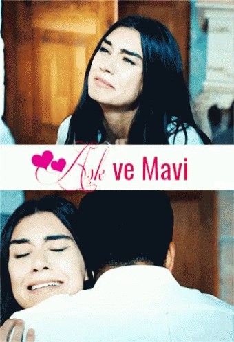 An emotional scene from Aşk ve Mavi, featuring Emrah and Burcu Kıratlı, as the woman cries while hugging the man.