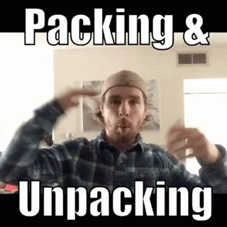 A man demonstrates American Sign Language (ASL) for 'Packing' and 'Unpacking' with expressive gestures.