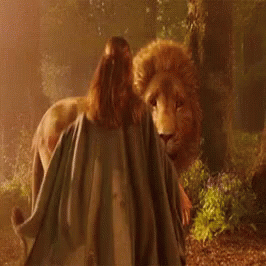 Aslan, the majestic lion from Narnia, gently interacts with a person in a dark, magical forest.