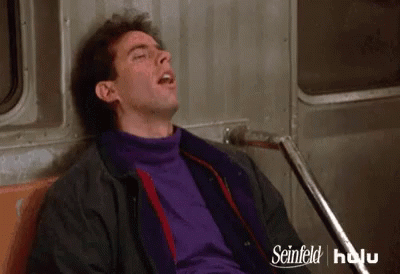 Jerry Seinfeld is seen comically asleep on a subway train, mouth open and nodding off.