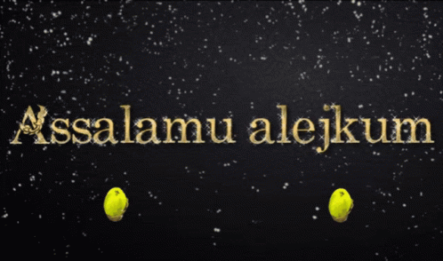 Golden 'Assalamu Alejkum' greeting on a sparkling black background, accompanied by animated yellow flowers.