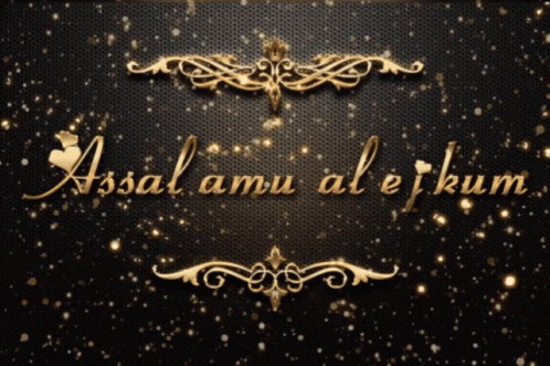 A beautiful animated golden greeting of "Assalamu Alejkum" on a sparkling dark background, conveying peace.