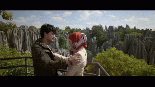 A couple shares a romantic hug in front of a stunning rocky landscape from the movie Assalamualaikum Beijing.
