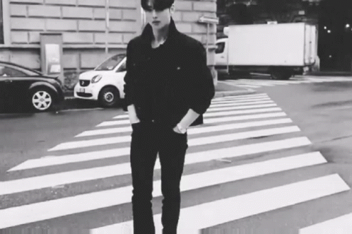 Astro's Cha Eunwoo walks confidently across a city crosswalk in a stylish black outfit.