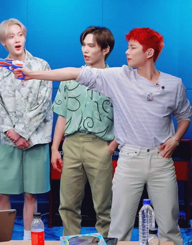 Astro member MJ points a toy gun at another member, with a third member standing by in a bright blue studio.