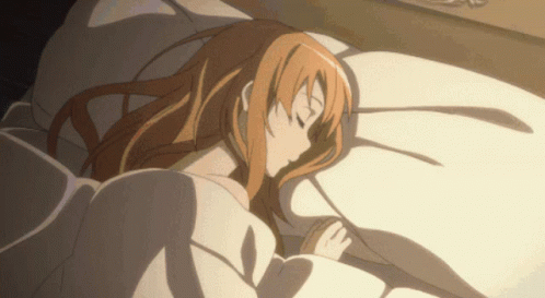 Asuna wakes up sweetly in bed after being gently touched by Kirito, smiling at him.