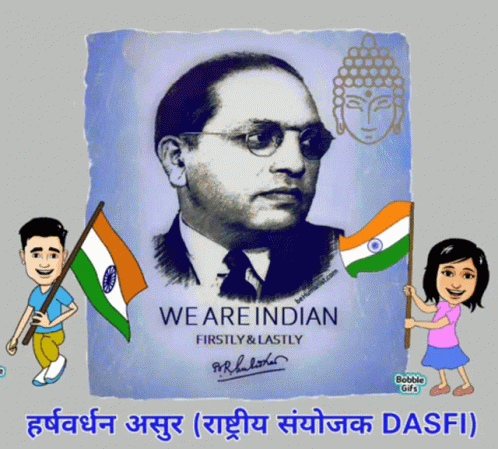 Asurharsh Drambedkar tribute featuring B.R. Ambedkar, Indian flags, and the message 'WE ARE INDIAN FIRSTLY & LASTLY'.