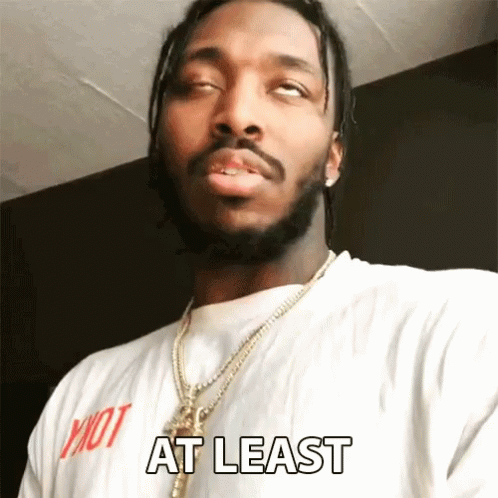 Pardison Fontaine looks up, with the caption 'AT LEAST' displayed, implying a humorous or self-deprecating statement.