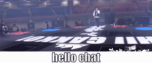 Atarashii Gakko no Leaders on stage at Budokan, greeting the chat with 'hello chat' displayed.